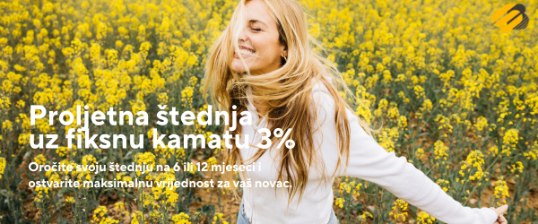 Iskoristite posebnu ponudu i oročite svoju štednju na 6 ili 12 mjeseci. Uz sigurnu štednju i mogućnost ulaganja do 100.000 EUR, Proljetnu štednju možete jednostavno ugovoriti u najbližoj poslovnici.